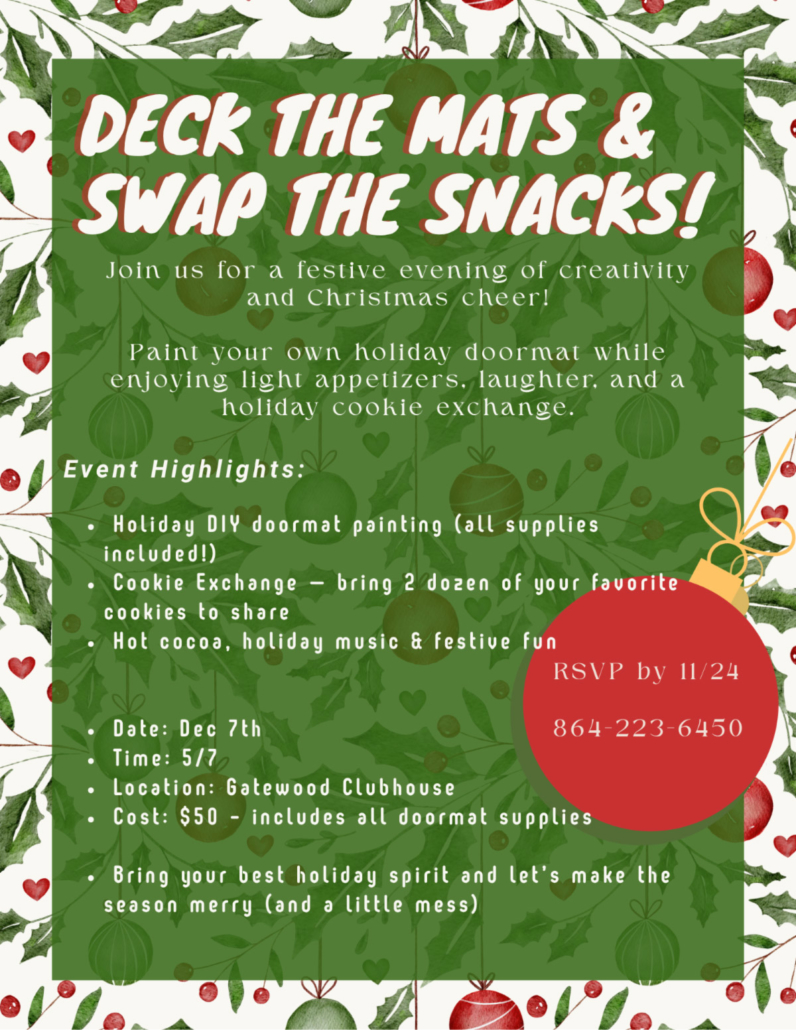 Paint your own holiday doormat while enjoying light appetizers, laughter, and a holiday cookie exchange.
